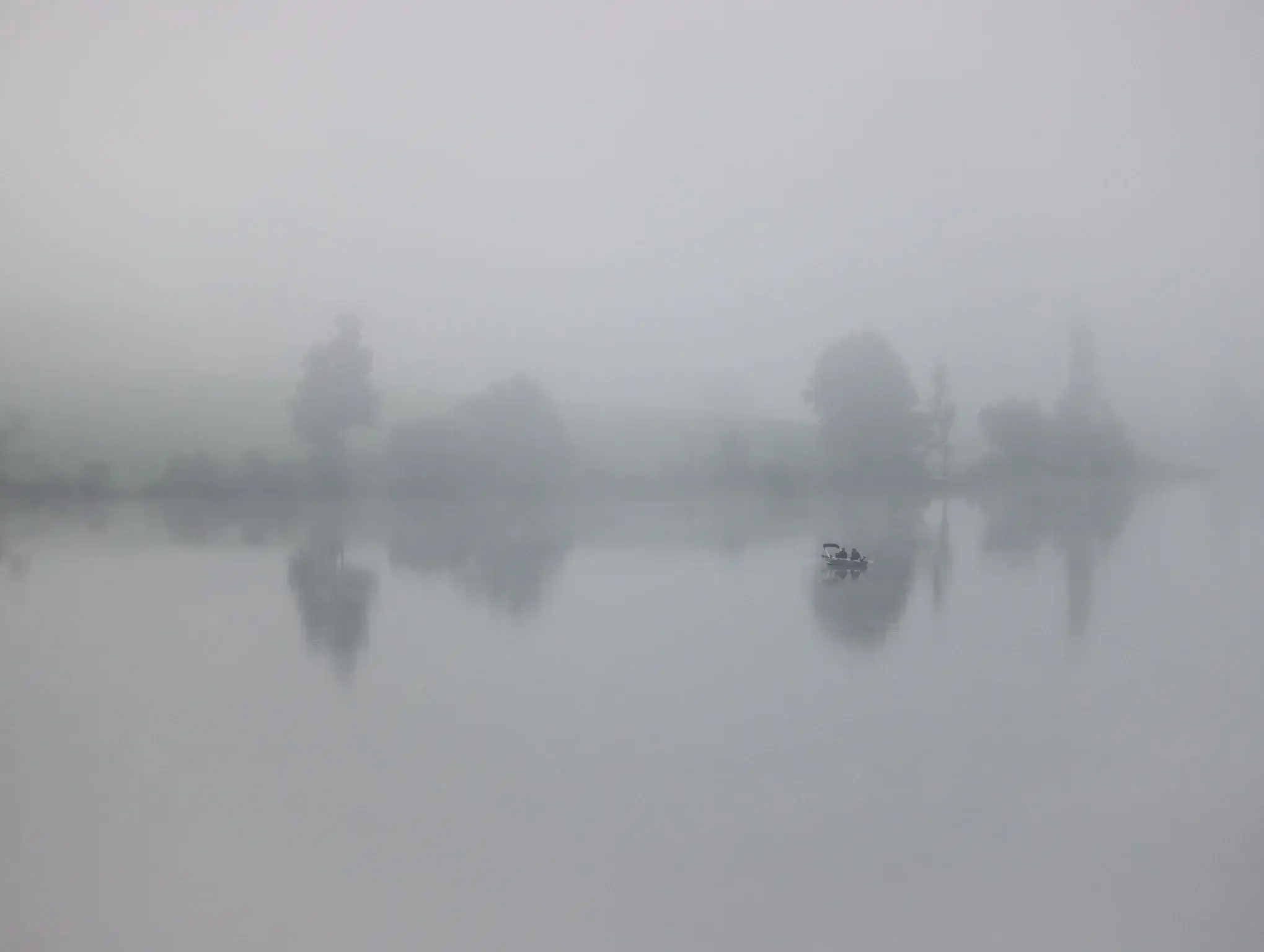 In a gorgeous silent morning with the lake Walchsee in Austria veiled in pale mist. During autumn nights, the air temperatures drop quickly. The water in the lake, however, remains warmer than the surrounding land. So the lake releases moisture into the cooler air above it and the air near the surface becomes saturated. With the air temperatures fall to the dew point by early morning, water vapor condenses into numerous tiny droplets, forming fog.