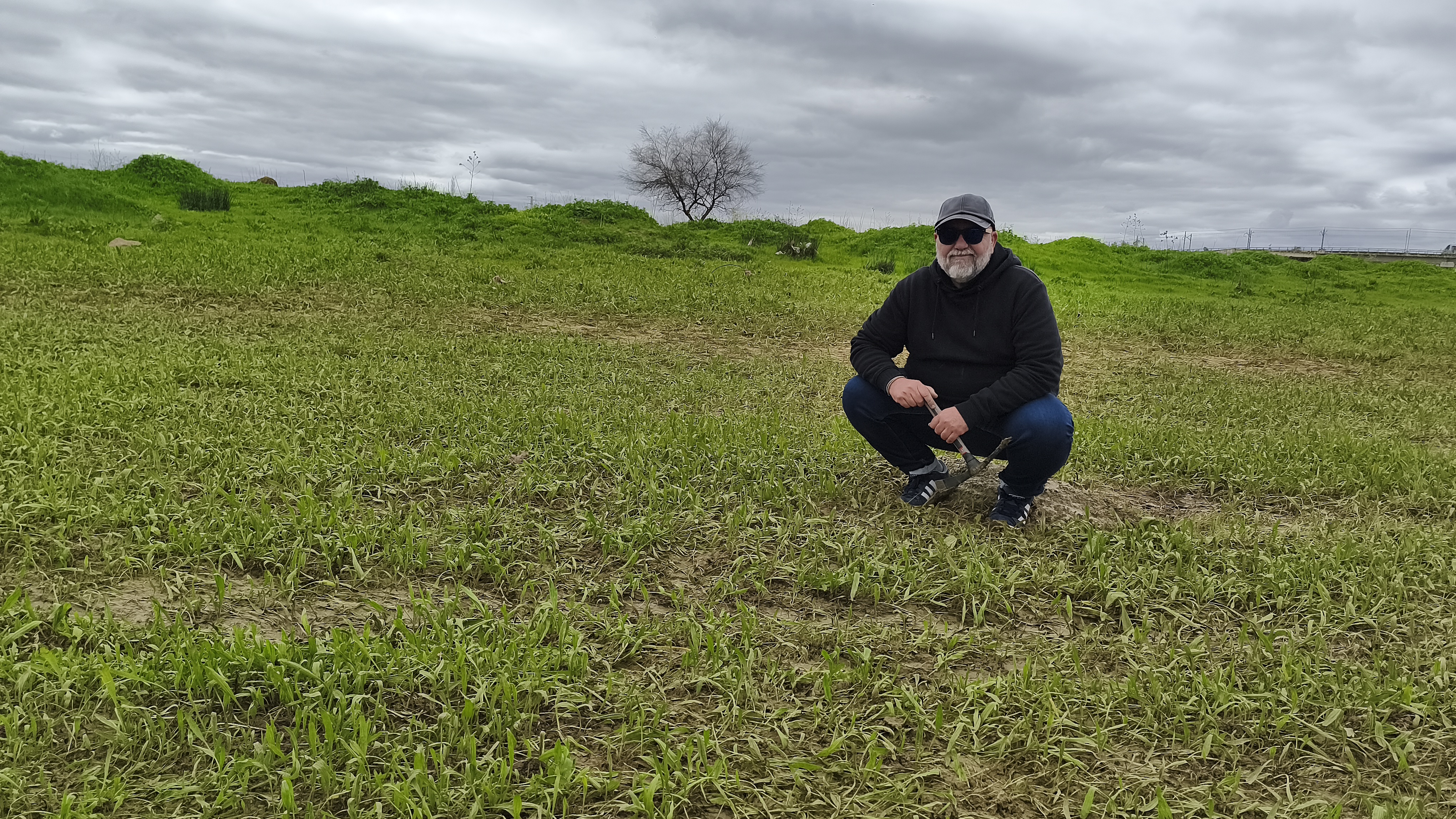 A pause for a photograph during field sampling on a low fluvial terrace associated with the channel of the Guadaira River (Seville, SW Spain). The landscape corresponds to a nearly flat to gently undulating surface that forms part of the present river terrace and is subject to periodic flooding, typically of short duration and low energy.