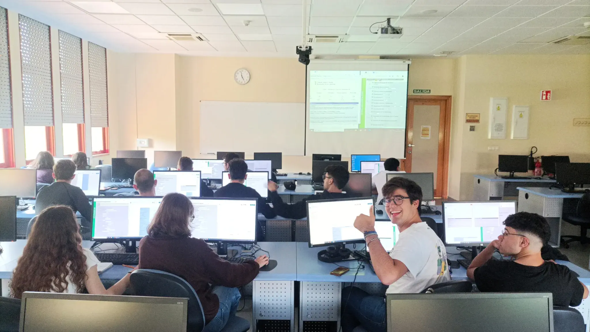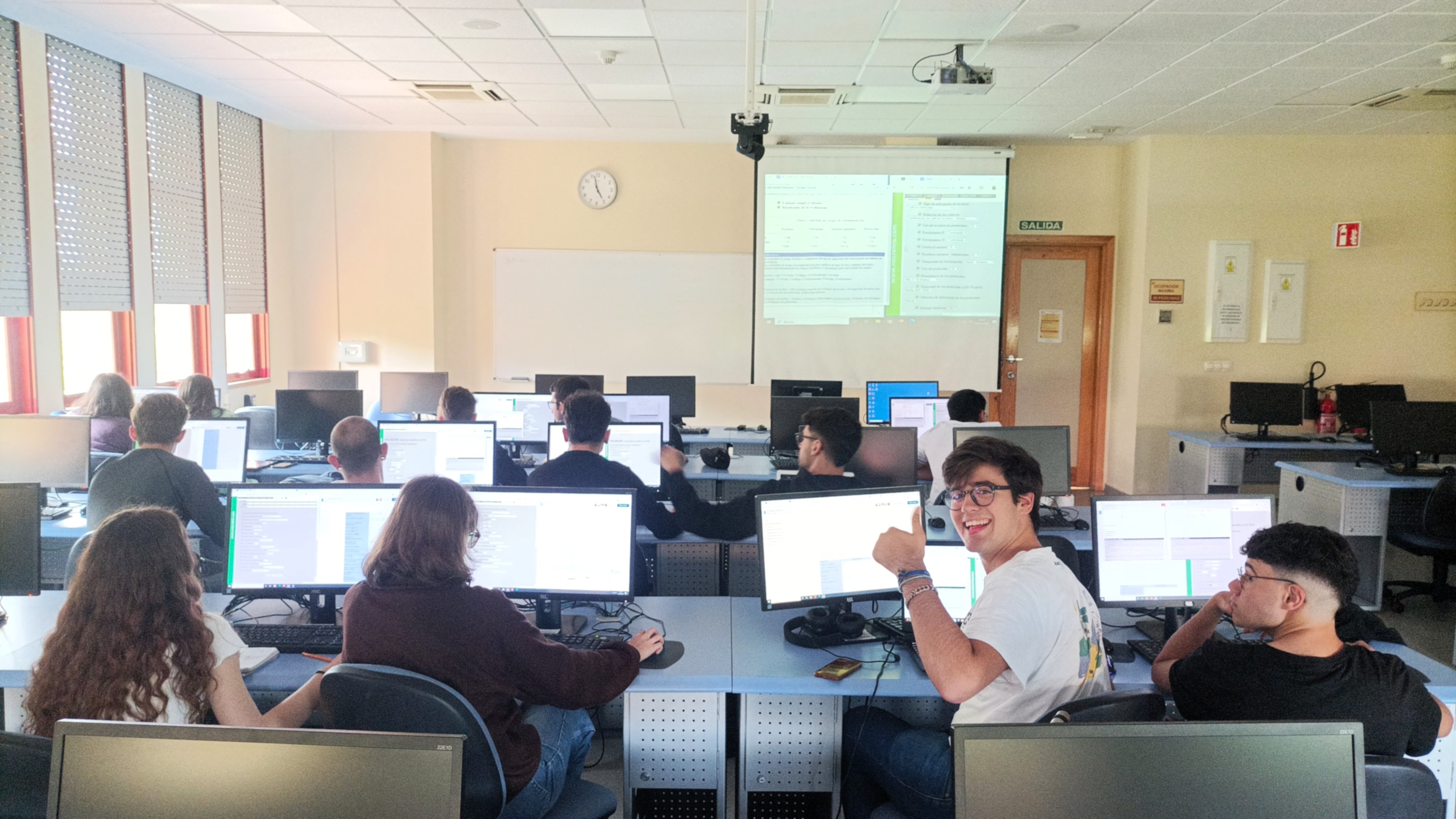 📖 La imagen muestra a estudiantes del Grado en Biología durante una sesión práctica de la asignatura de Ciencia del Suelo. En el aula, trabajan con modelos digitales de evaluación del suelo, aplicando conceptos teóricos a situaciones reales. Uno de los estudiantes se gira hacia la cámara y levanta el pulgar, transmitiendo un ambiente positivo y participativo durante el aprendizaje.