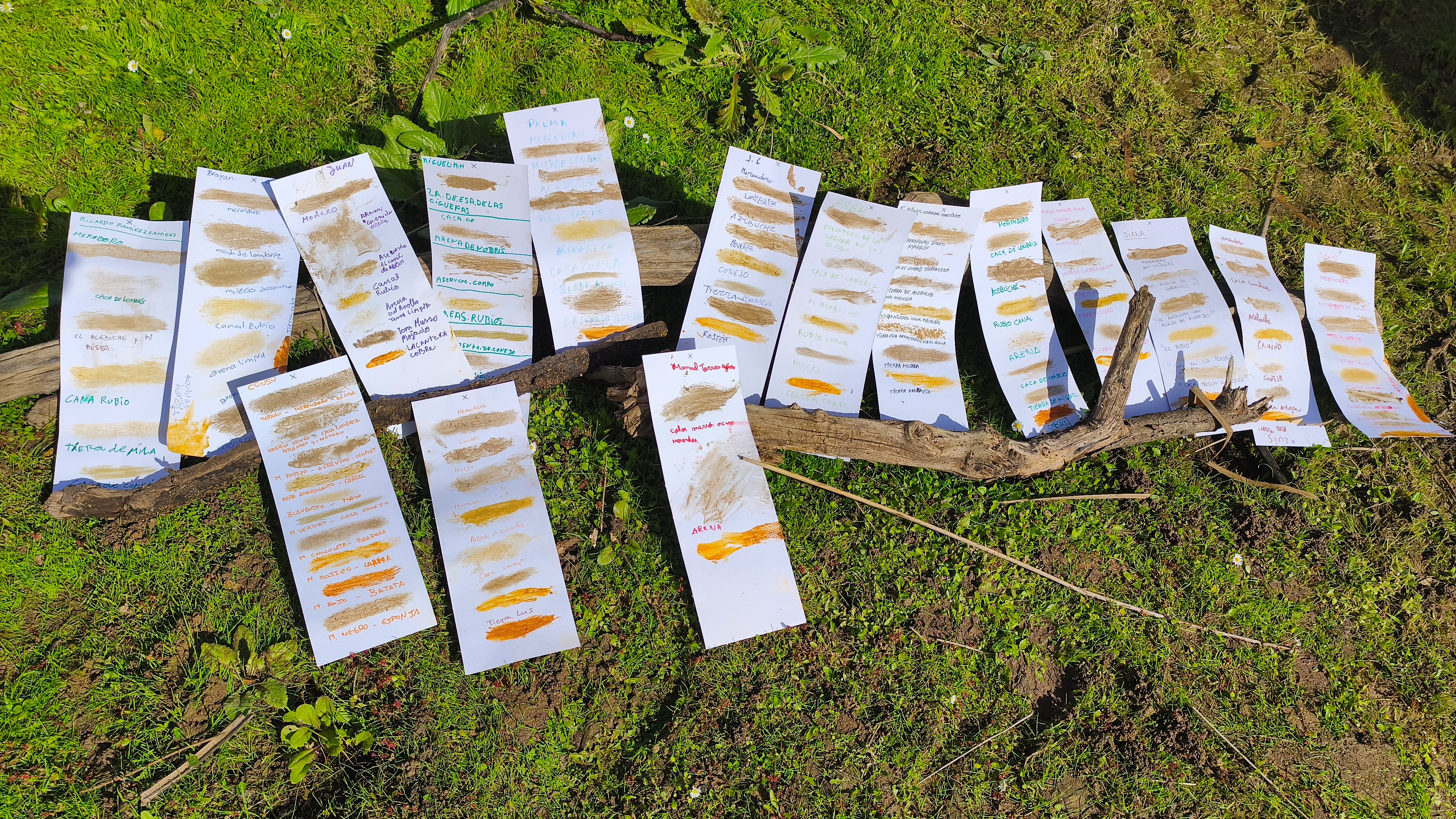 Las hojas de papel se transformaron en cuadernos sencillos de colores del suelo 📒: táctiles, visuales y personales. Diferentes tonos de marrón, rojo, ocre o gris aparecían uno junto a otro 🤎🧡🩶, acompañados de nombres imaginativos y pequeñas anotaciones ✍️. Lo que podría parecer una simple mancha de tierra se convertía en una cartografía íntima 🗺️ que conecta suelo, paisaje y experiencia.