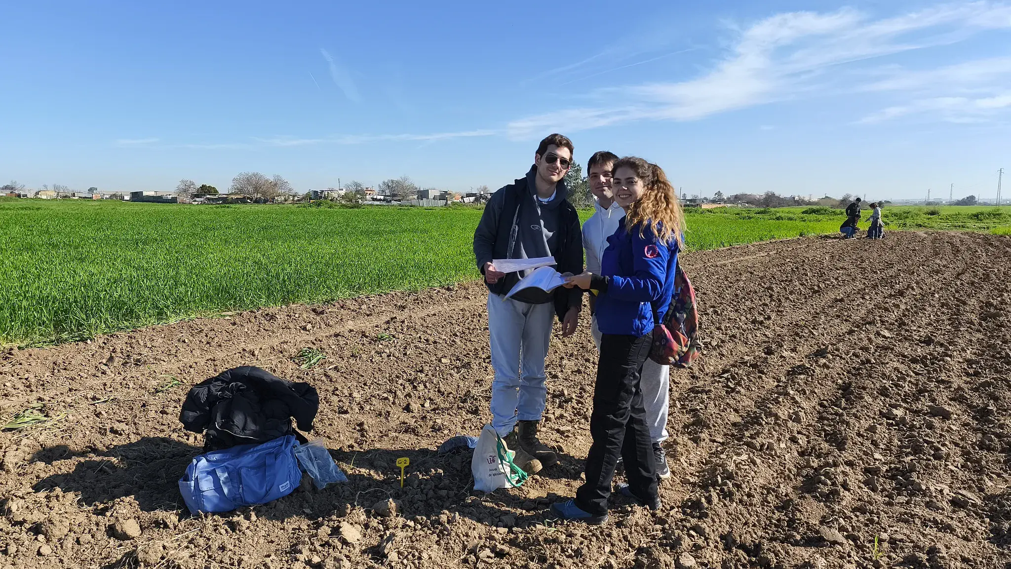 The photograph shows students from the Soil Science course at the Higher Technical School of Agronomy of Seville during a field practical session. Standing on a recently tilled agricultural plot, they consult their notes while discussing sampling locations and site characteristics. Around them, tools, sample bags, and field markers reveal an active learning environment where observation, discussion, and hands-on work come together. The scene captures a moment of shared attention, with the landscape itself acting as an open textbook 📒🌱.