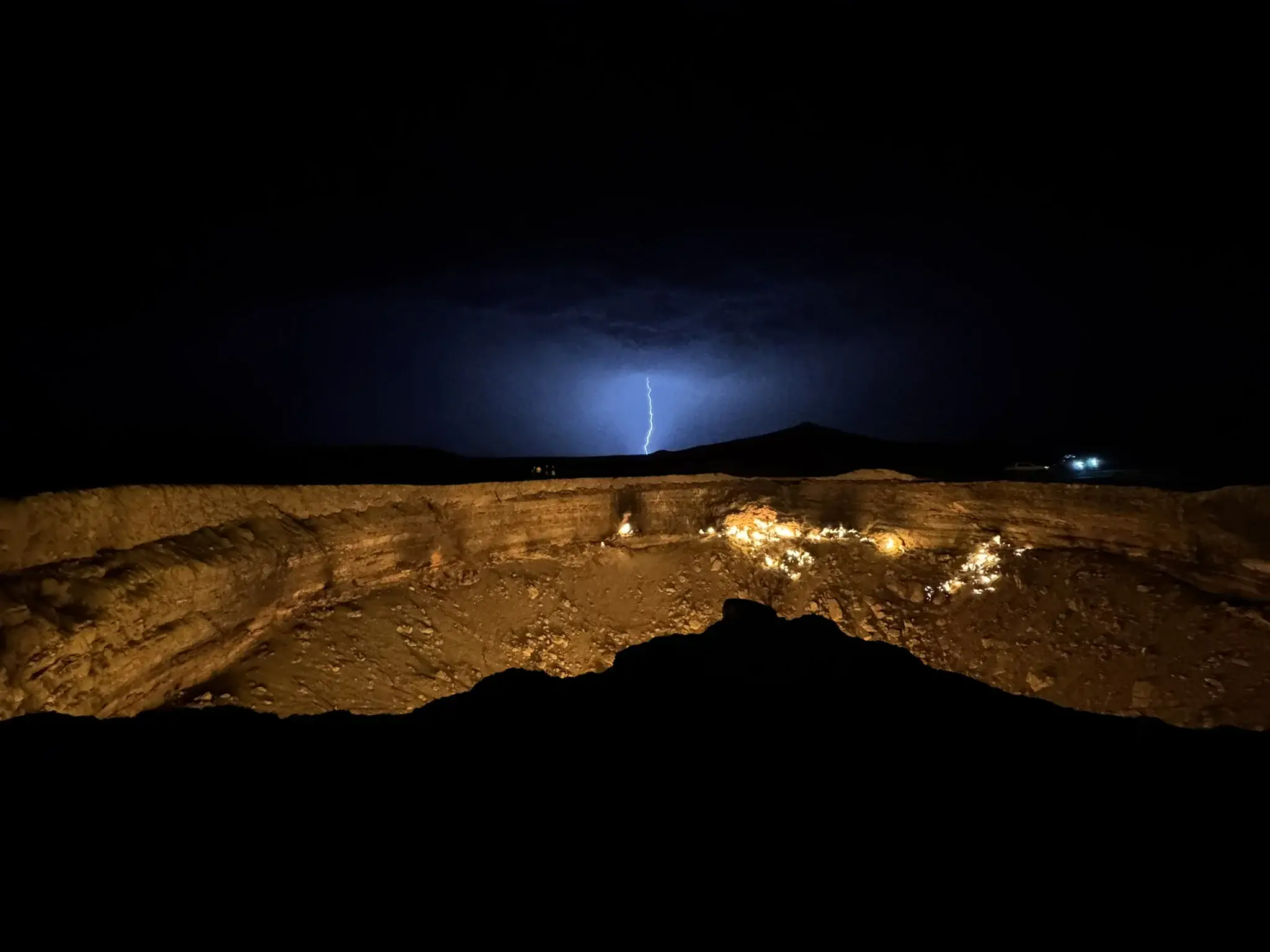 The Gates of Hell — a gas crater burning for decades — captured with simultaneous lightning in Turkmenistan's Karakum Desert, creating a surreal collision of fire and lightning in the night sky.