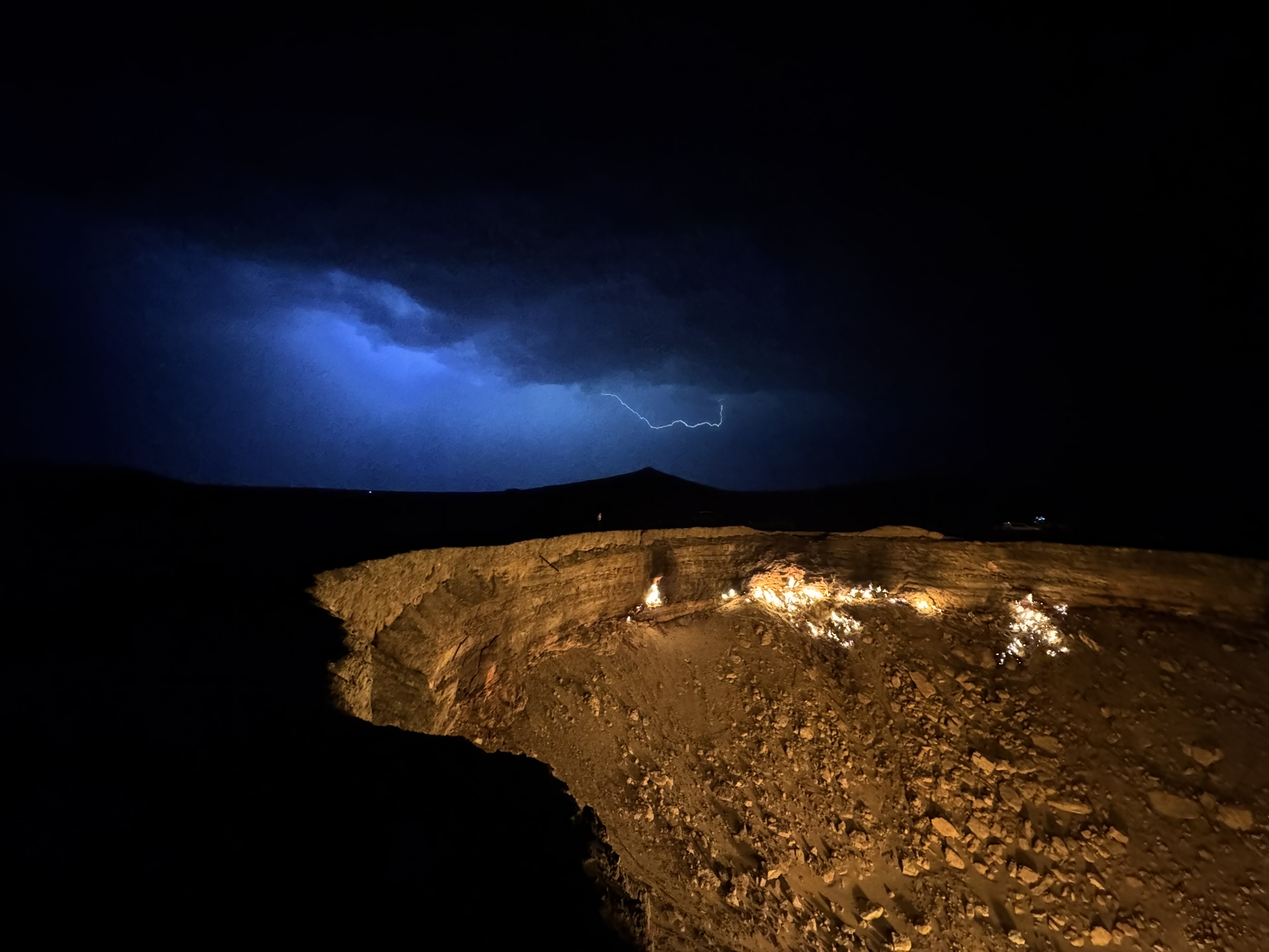 Darvaza Crater, burning since 1971, lit by flames while lightning strikes during a rare desert thunderstorm at night.