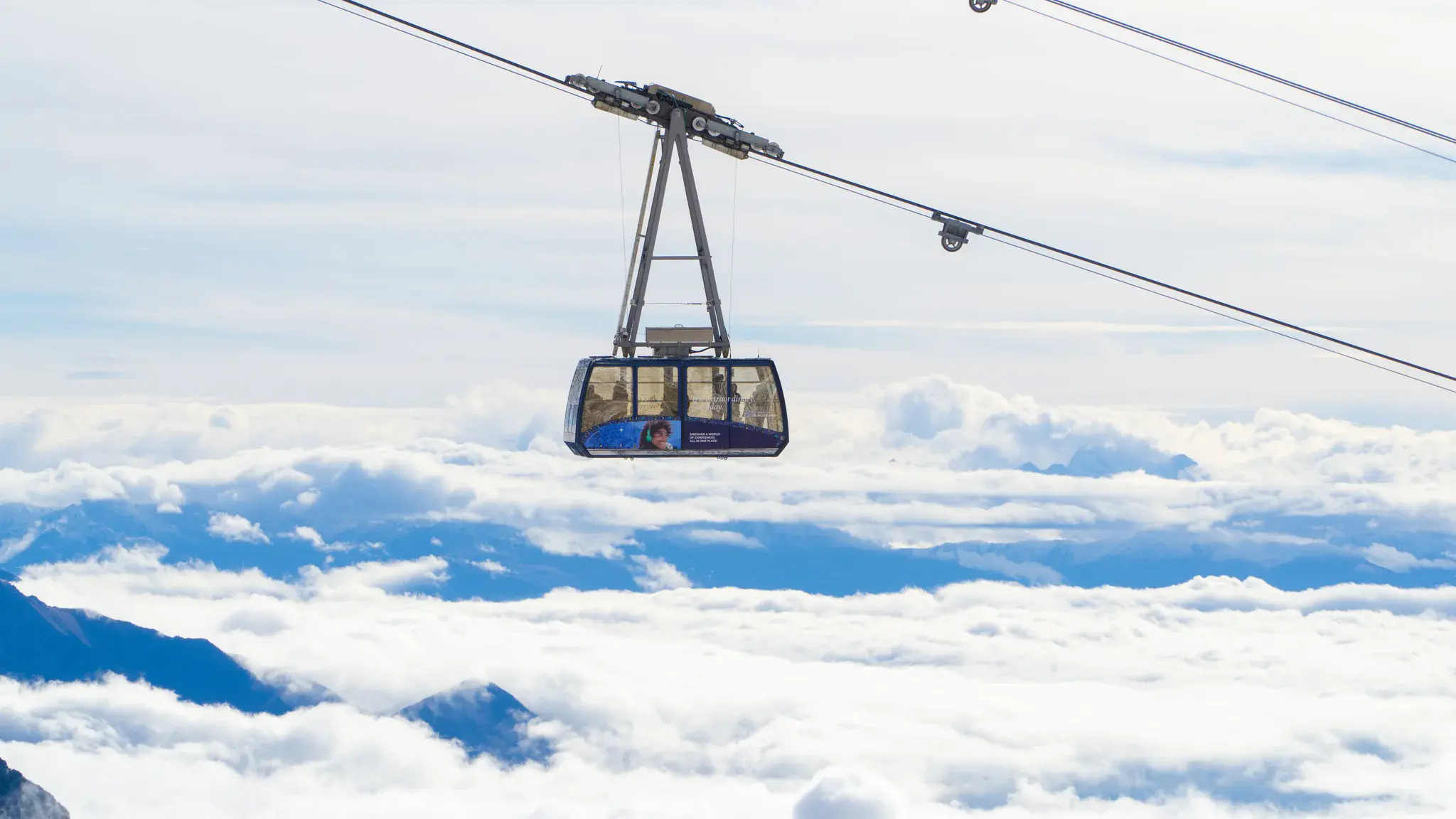 A cable car transiting high above a vast sea of clouds in the Alps, with mountain peaks breaking through the thick clouds.