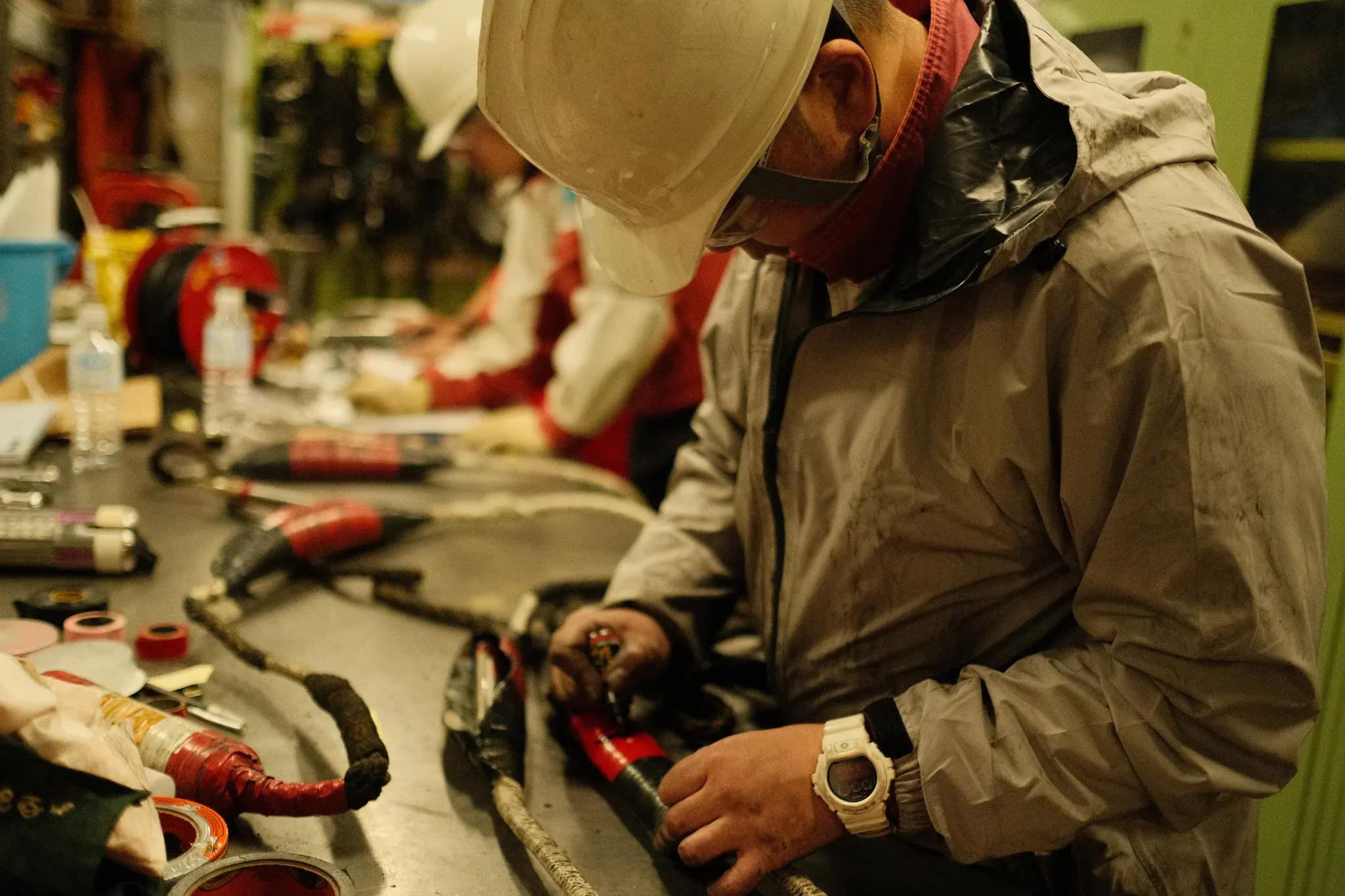 On the D/V Chikyu, an engineer performs a final inspection on the outer cover for a temperature sensor before the borehole observatory installation during IODP Expedition 502E. This last step is critical to ensure the instrument will be able to withstand the extreme conditions and operate accurately in the borehole to collect temperature data from the plate boundary fault in the Japan Trench.