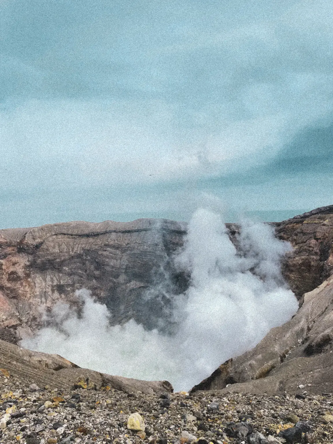 Mount Aso is one of the world’s largest active volcanic systems, located in Kyushu, southern Japan. Its vast caldera was formed by massive eruptions, and the Nakadake crater remains active today, emitting steam and volcanic gases continuously.
