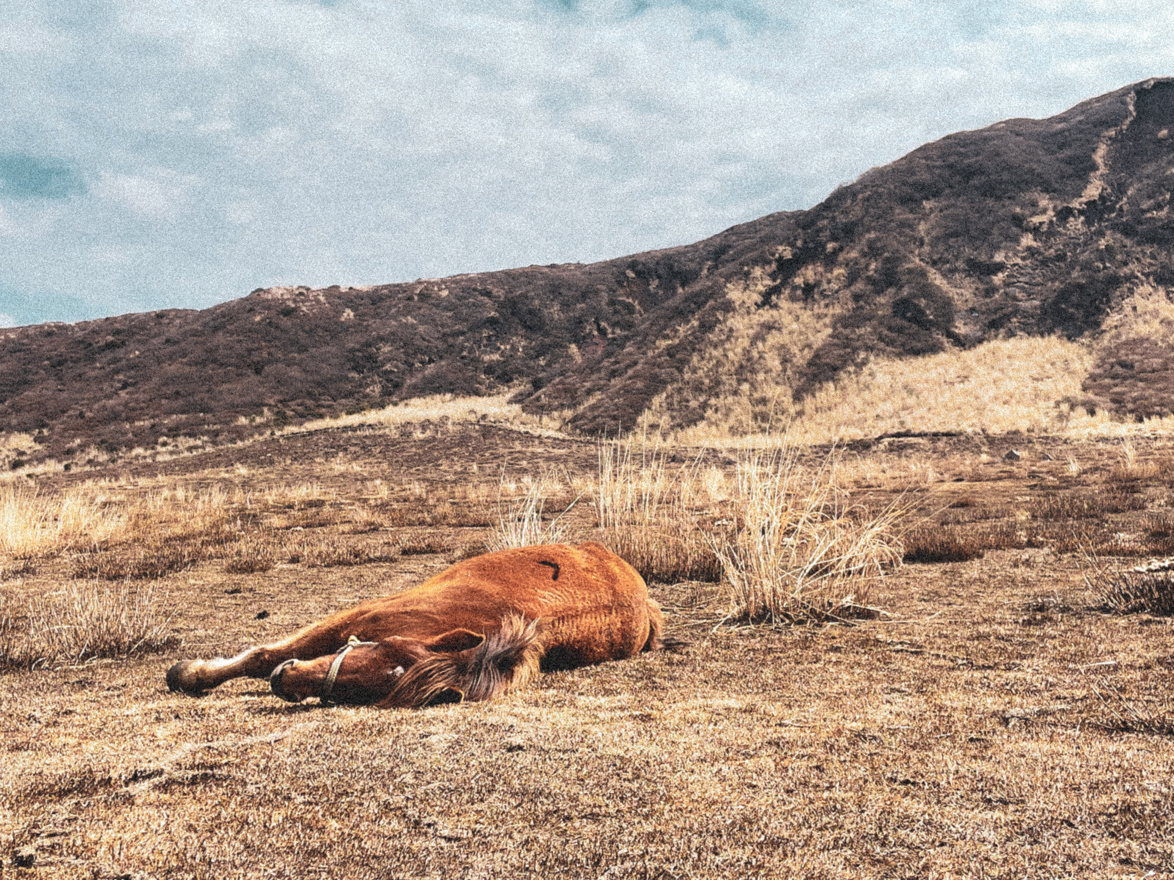 A grazing horse lies in the early spring grasslands near Mount Aso, Kyushu. Shaped by volcanic soils and seasonal burning, these landscapes support traditional grazing