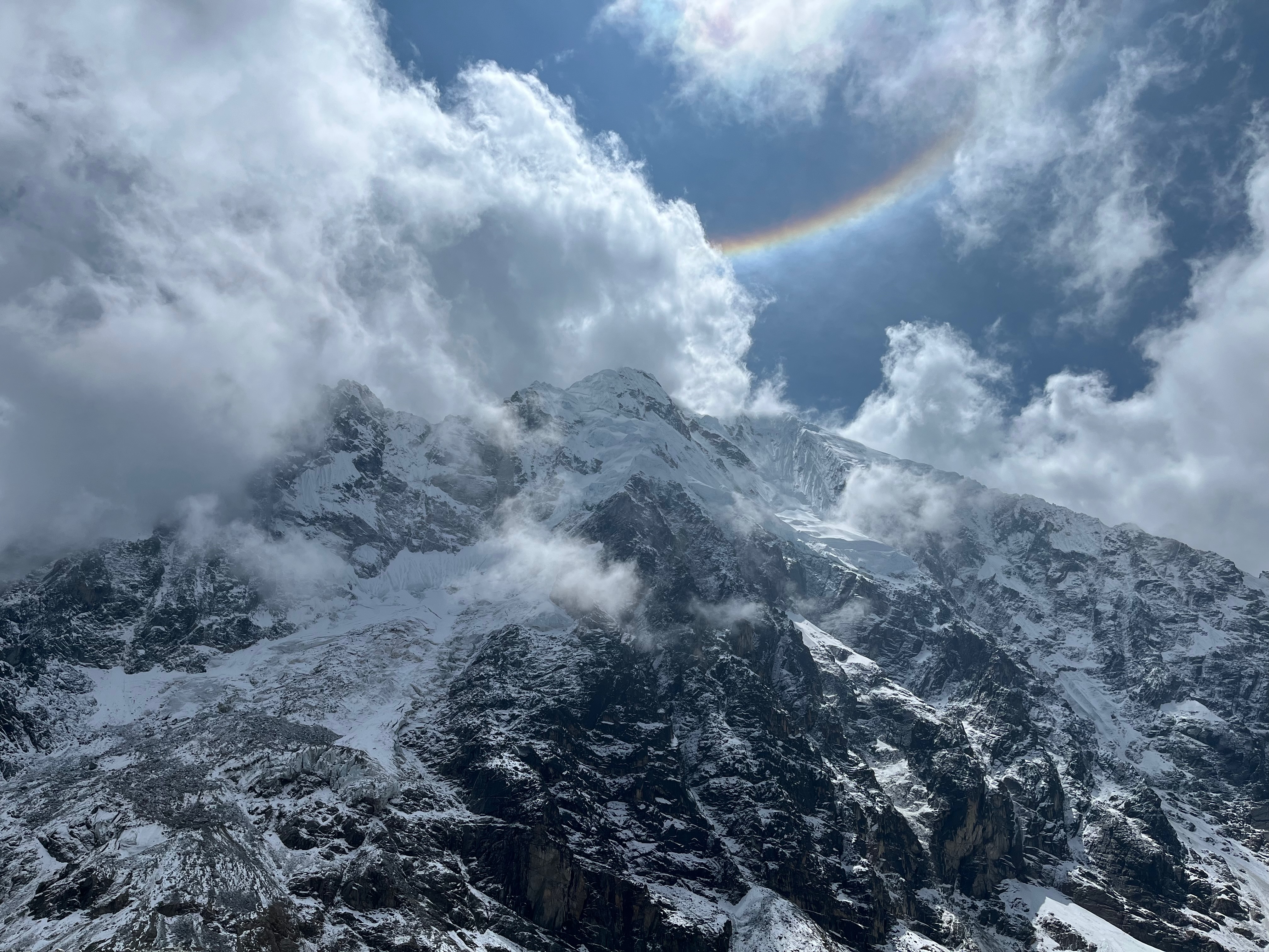 Cumulus clouds, a circular halo and the snow capped summit of the Salkantay mountain in the Peruvian Andes at 4630 meters height, South America.