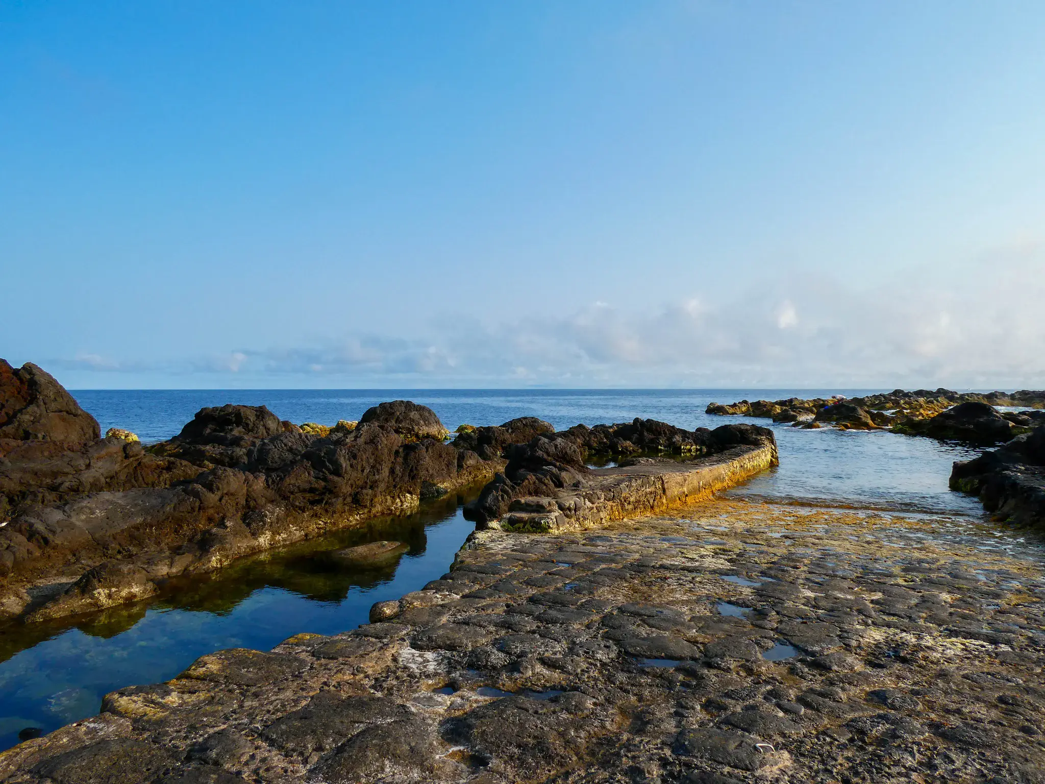 Solidified basaltic lava flows form natural pools and channels along the coastline at Faial Island (Azores, Portugal), while a small harbour structure illustrates human adaptation to volcanic terrain. Cooling fractures and marine erosion illustrate the dialogue between volcanic activity and ocean dynamics.