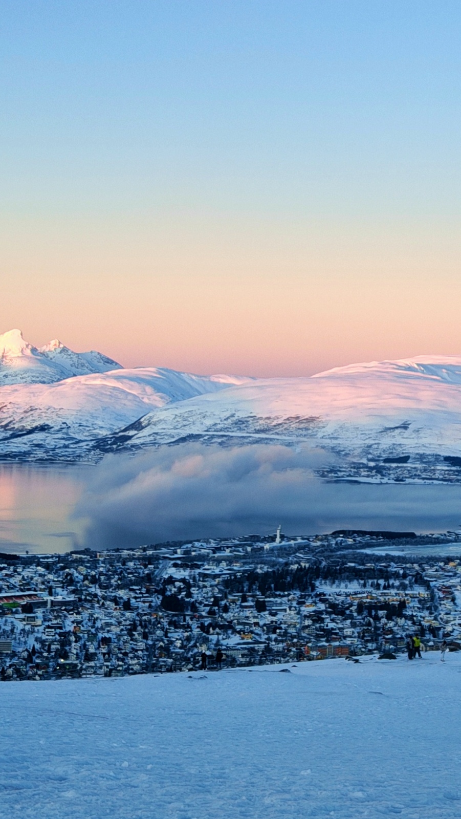 A low-level cloud lingers above the fjord in Tromsø, Norway, confined between the sea and surrounding mountains. Likely shaped by temperature inversion and local topography, it remains suspended near the surface, revealing the structure of the atmospheric boundary layer. Snow-covered mountains, a coastal city, and the Arctic winter light together show how atmosphere, terrain, and ocean interact in a high-latitude environment.