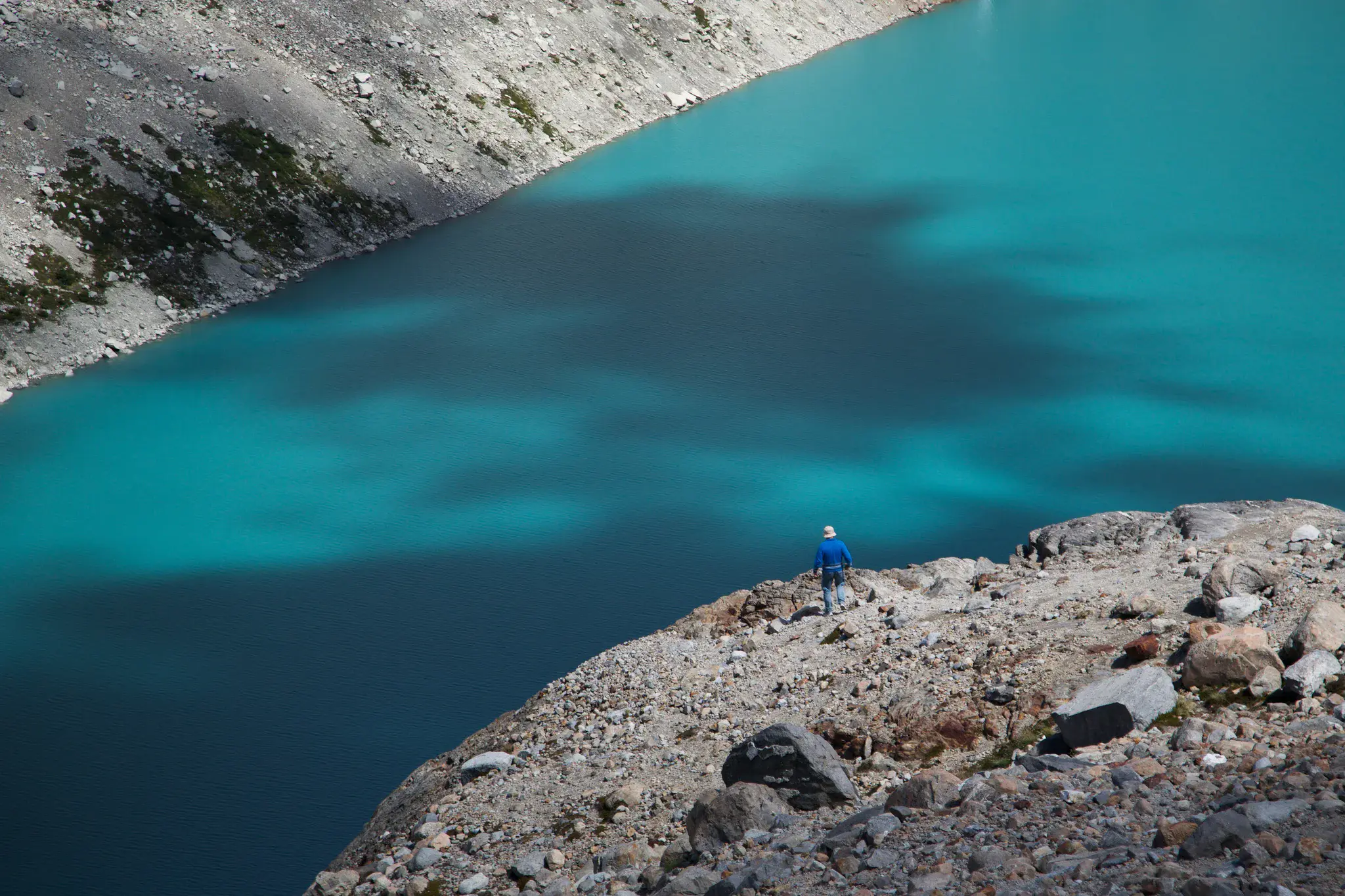 A hiker overlooks the turquoise waters of Laguna Sucia in Los Glaciares National Park, Patagonia, Argentina. This landscape also reflects long-term environmental change: in photographs taken in 1945 by the Italian priest and mountaineer Alberto de Agostini a glacier covered most of the lagoon. Its retreat since then illustrates the visible impact of climate change in Patagonia.