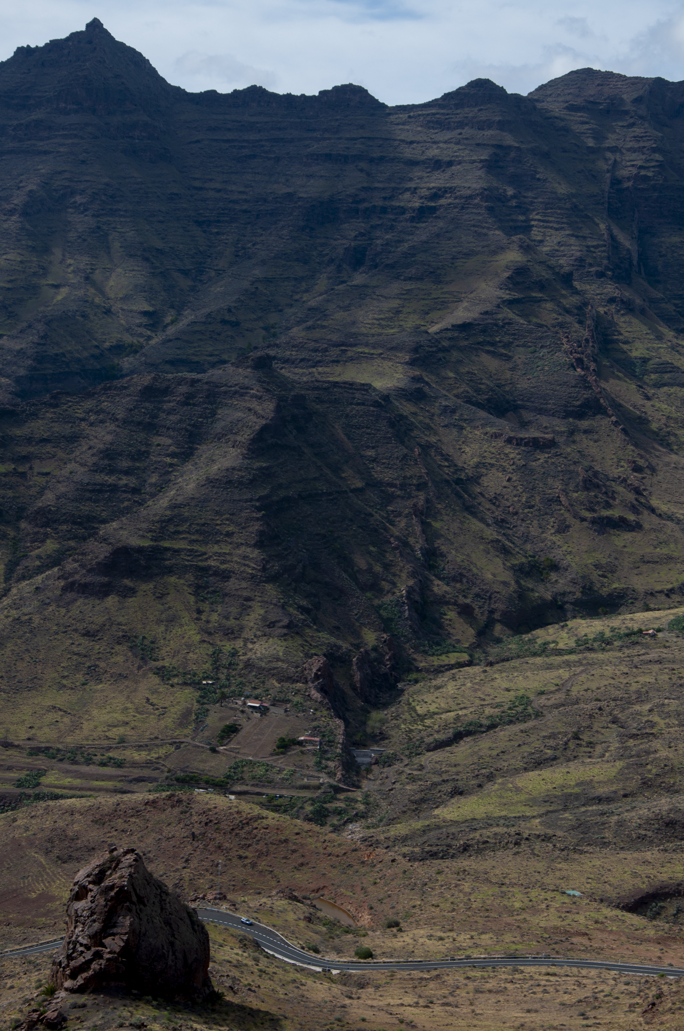 An igneous dyke can be traced throughout the entire Veneguera valley on Gran Canaria, Spain. The road was cut straight through this feature, but the farmer in the background rather decided to embrace the dyke and use it as a natural boundary for their farm.