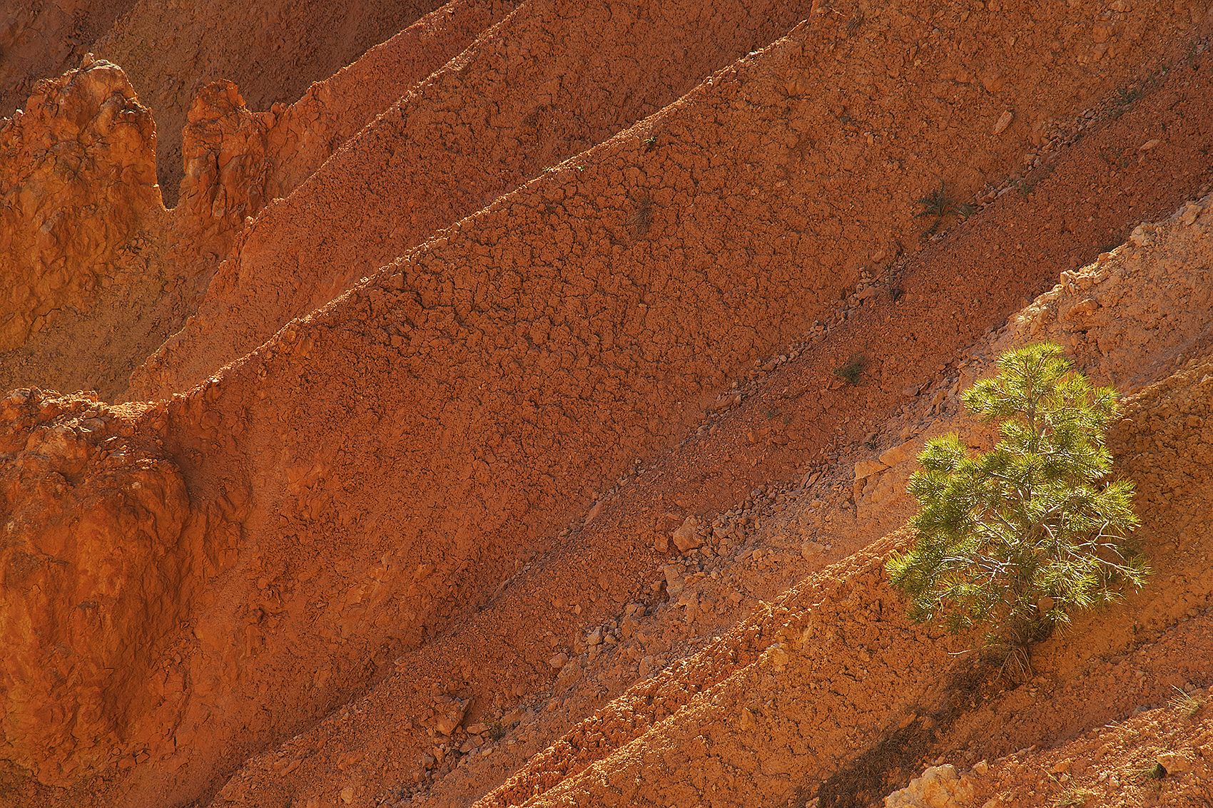 Bryce Canyon formed over 50 million years of tectonic uplift and intense water, wind, and ice erosion that created the famous "hoodoos". The area is also home to different pines that survive in this harsh and arid environment through different strategies. This young individual of Colorado Pinyon (Pinus edulis) fights against steep slopes and dry soils through deep root systems that access water, allowing it to tolerate droughts, and relying on symbiotic relationships with birds for seed dispersal.