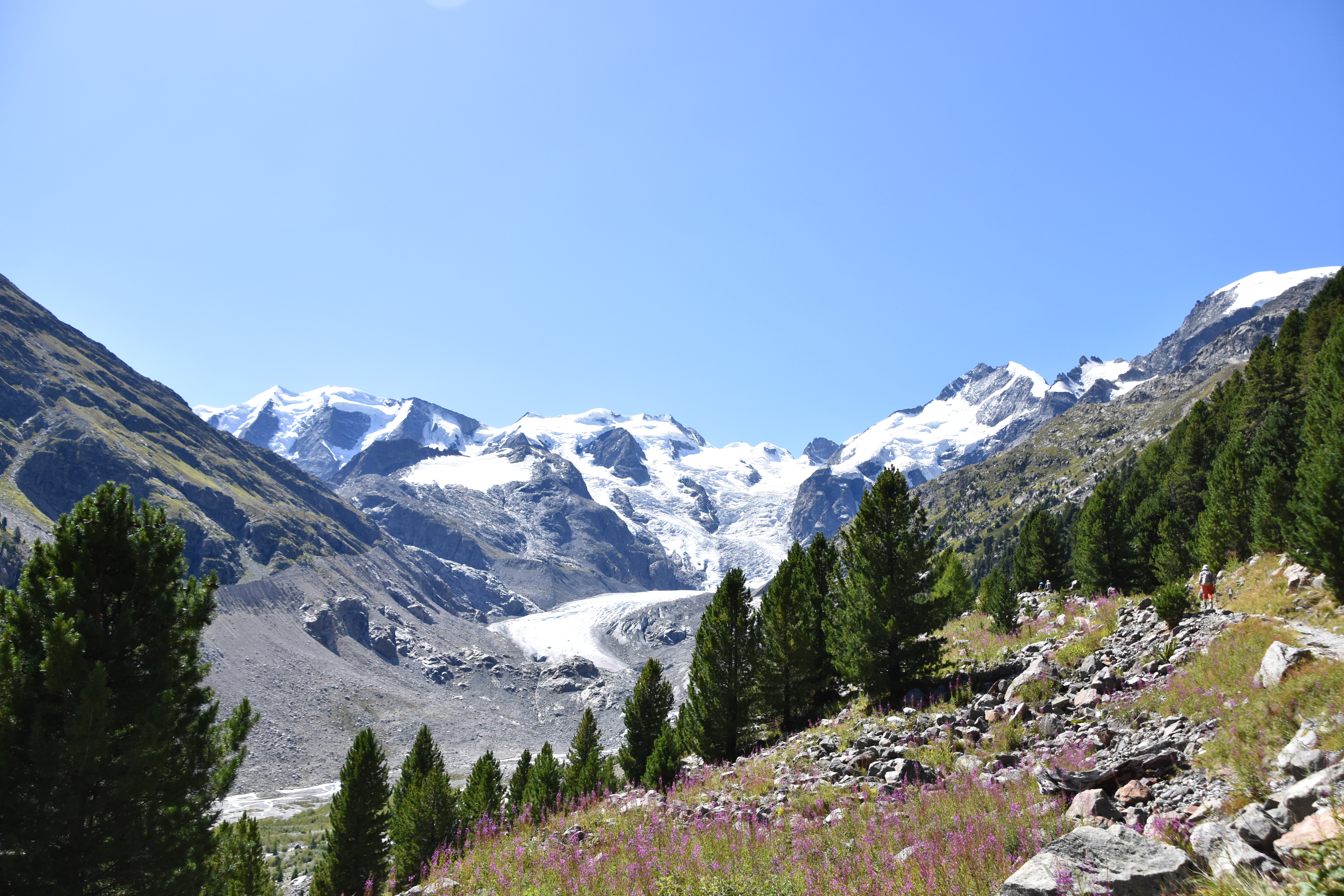 This image from the Swiss Alps captures the transition zone between alpine ecosystems and glacial environments. In the foreground, vegetation thrives in a short growing season, while in the background, a retreating glacier reflects longer-term climatic shifts. This juxtaposition highlights the close coupling between the cryosphere and biosphere, where glacier dynamics influence hydrology, sediment transport, and ecosystem development. As glaciers continue to shrink, these high-mountain environments are undergoing rapid ecological and geomorphological transformation, making them key natural laboratories for studying Earth system interactions under climate change.