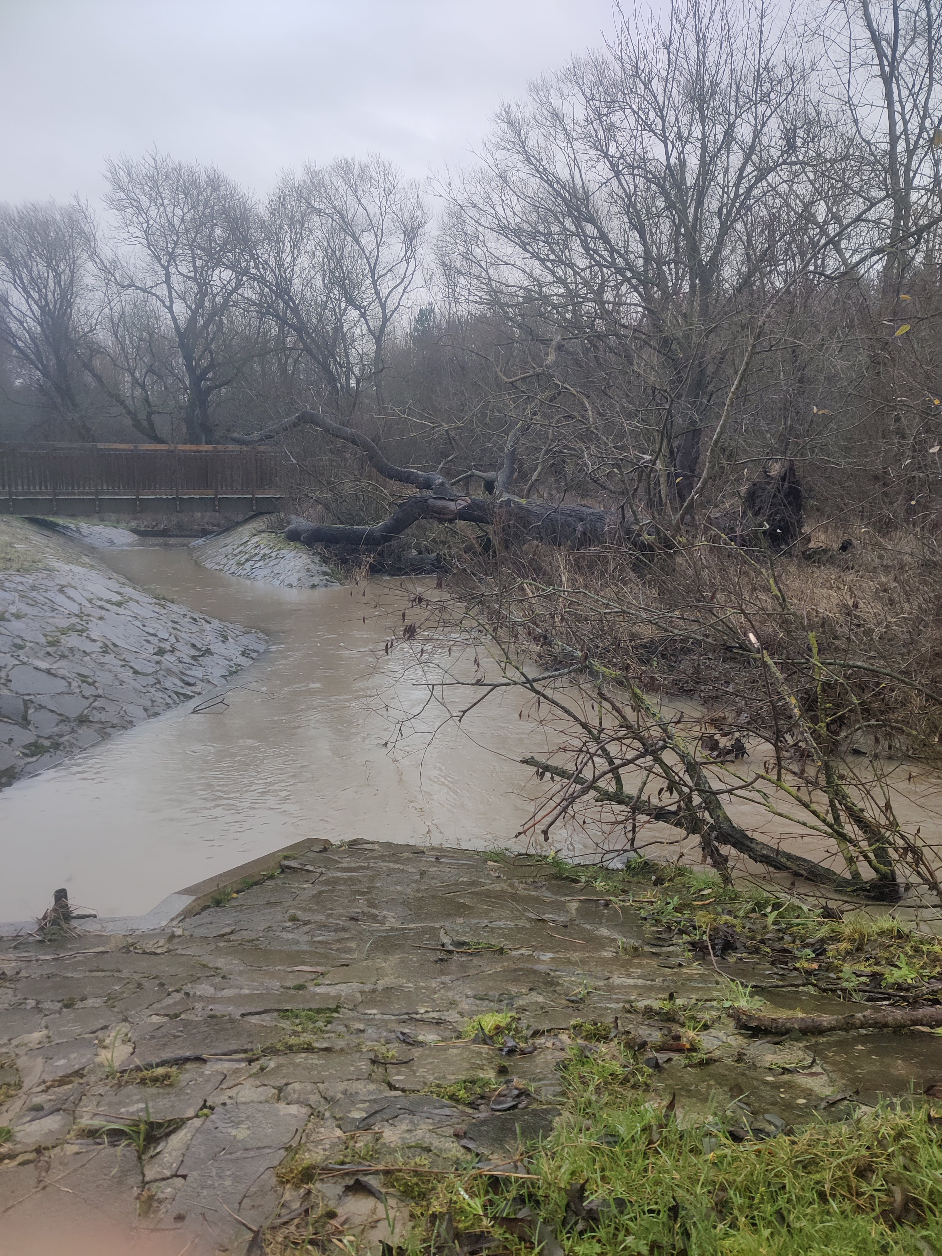 Between flood alerts and fleeting time, we chase storms on the field. The picture shows the stream overflows and entering storage areas, allowing to hold back flood peaks.