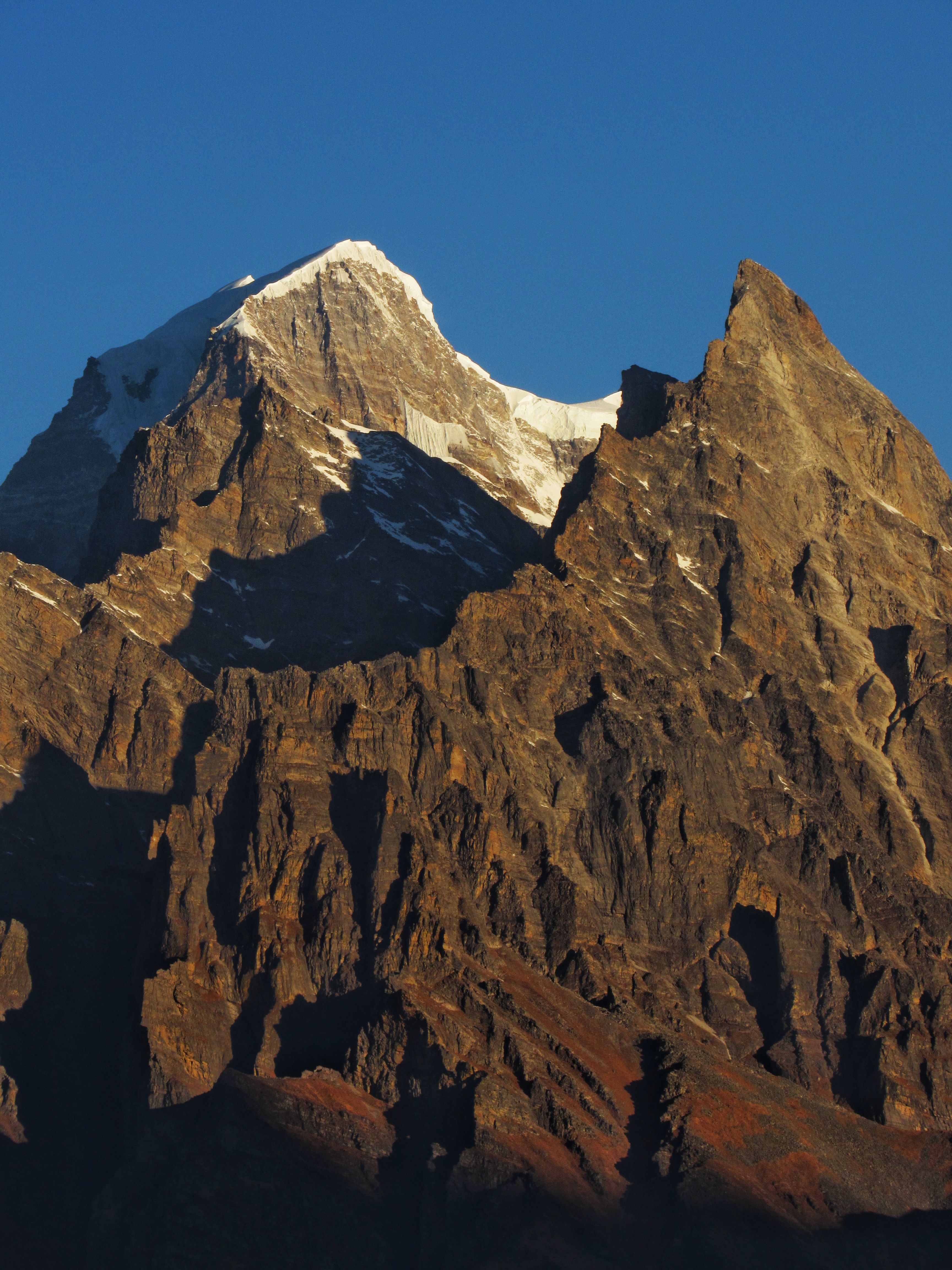 Hathi Parvat ("Elephant Peak") in the Nanda Devi Biosphere Reserve stunningly reveals the interplay between tectonic uplift and surface erosion. Steep rock faces and deeply incised gullies reflect sustained exhumation and mass wasting, while perennial snow persists on the highest elevations. The landscape captures a transient balance where rock is continuously raised and simultaneously removed, shaping the dramatic relief of the High Himalaya.