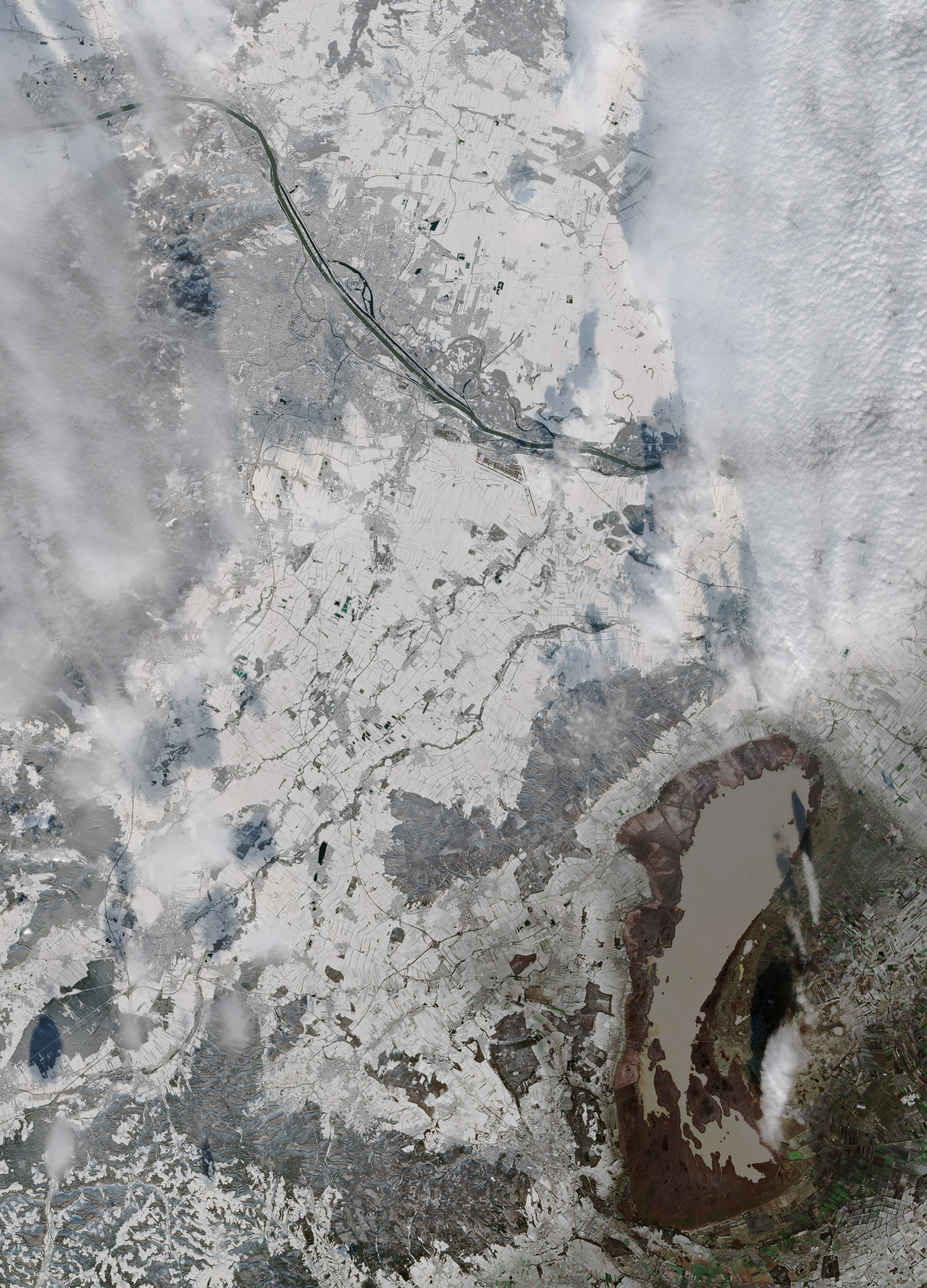 Vienna under snow: a white, frozen patchwork stretches across the landscape, while Lake Neusiedl appears like a heater—its surroundings largely snow-free, standing in stark contrast to the cold terrain around it. Sentinel 2 image.