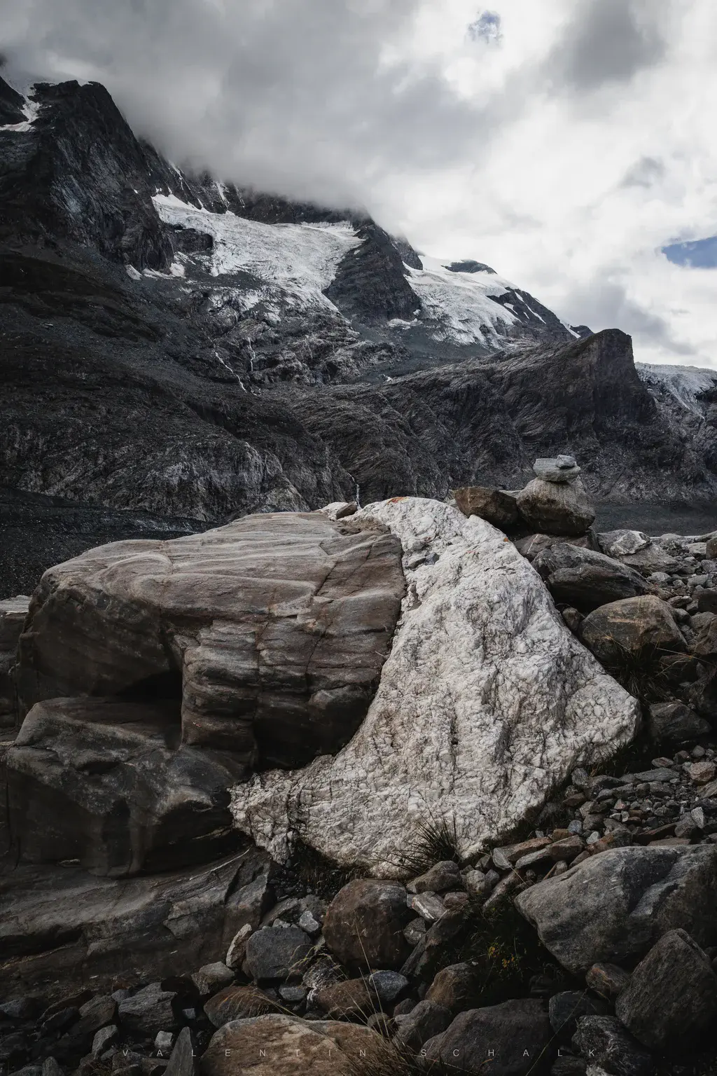 We came across this quartz vein during a glacier survey in the Großglocknergruppe, Austria, a pale, fractured body cutting through the darker rock like a frozen flow, its rough white surface streaked with fine veins beneath the shadow of the glacier.